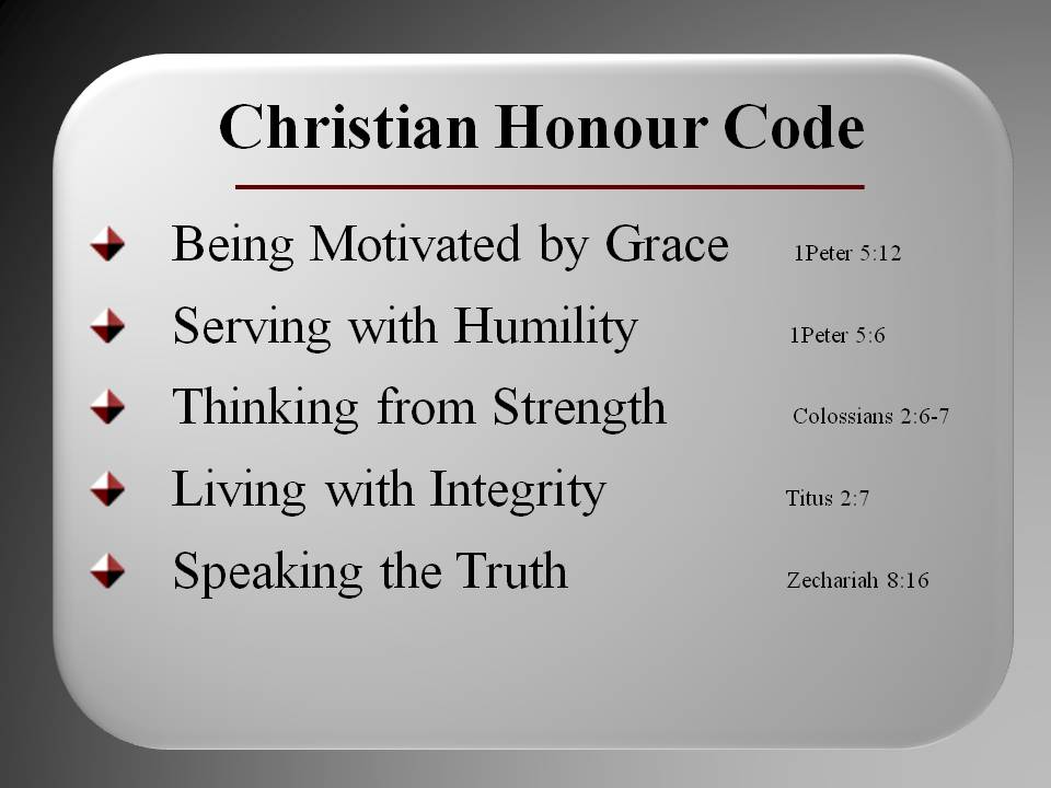 Believers are commanded to “Grow in the Grace and Knowledge of our Lord Jesus Christ.” We can have the Mind of Christ in us. The virtues, standards and power that sustained Christ on earth can become part of our very own Honour Code